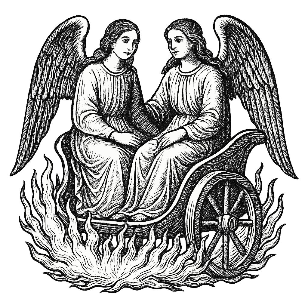 He manifests as a beautiful angel, riding a chariot of fire, surrounded by radiant light.