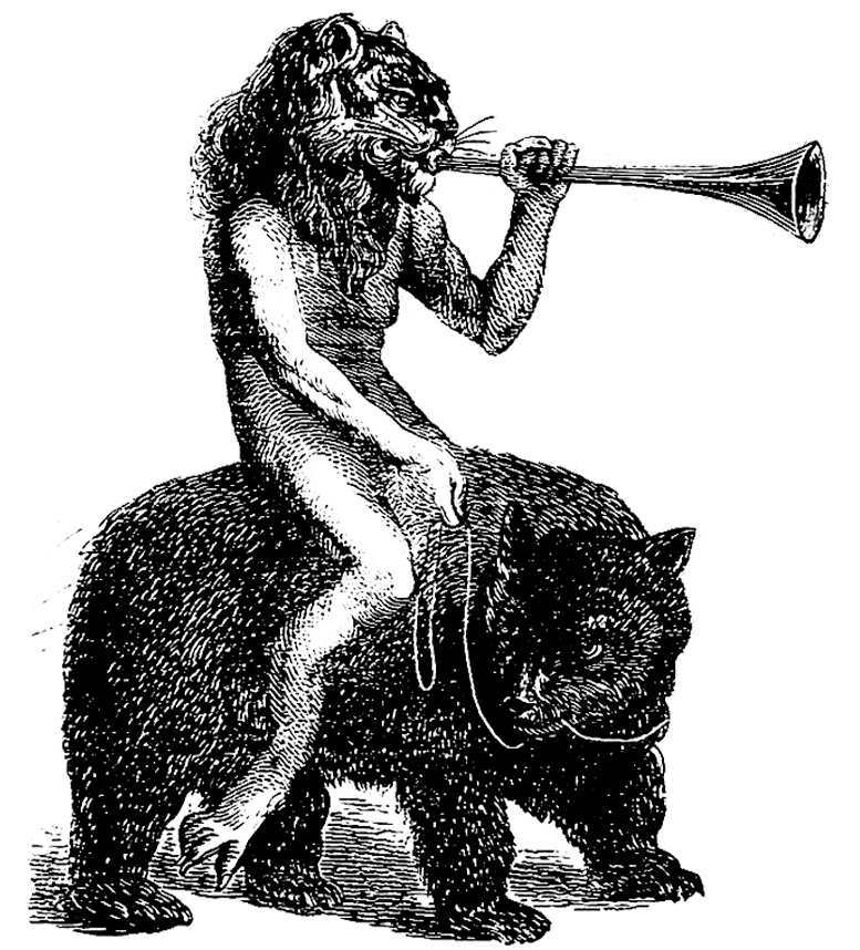 He appears as a man with the face of a lion, riding upon a mighty bear.